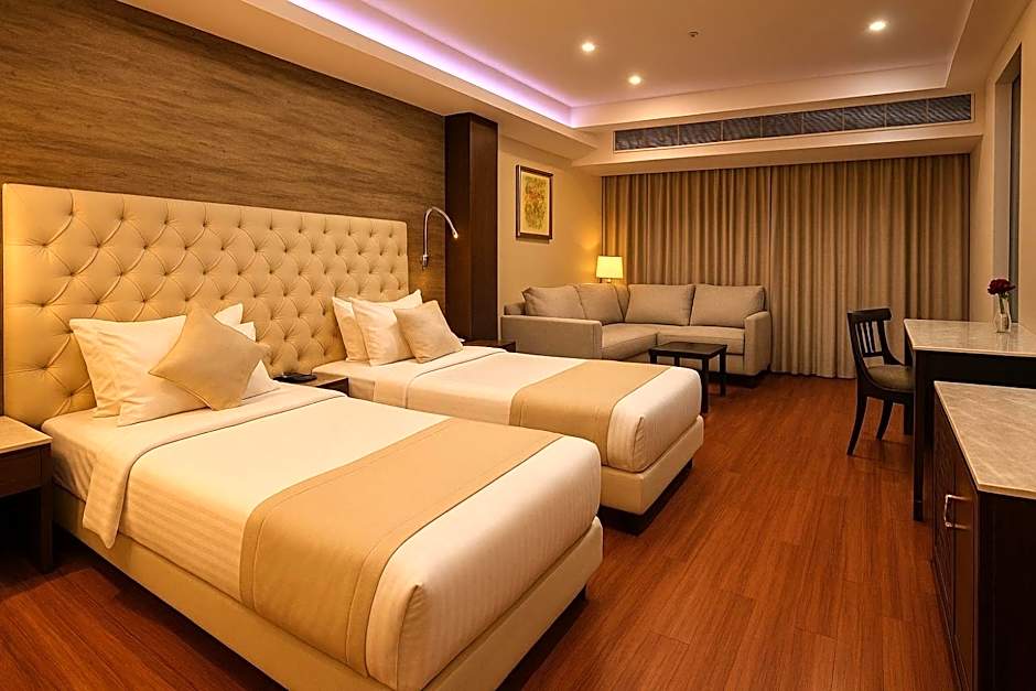 This large double room features a seating area, tile/marble floor and air conditioning.